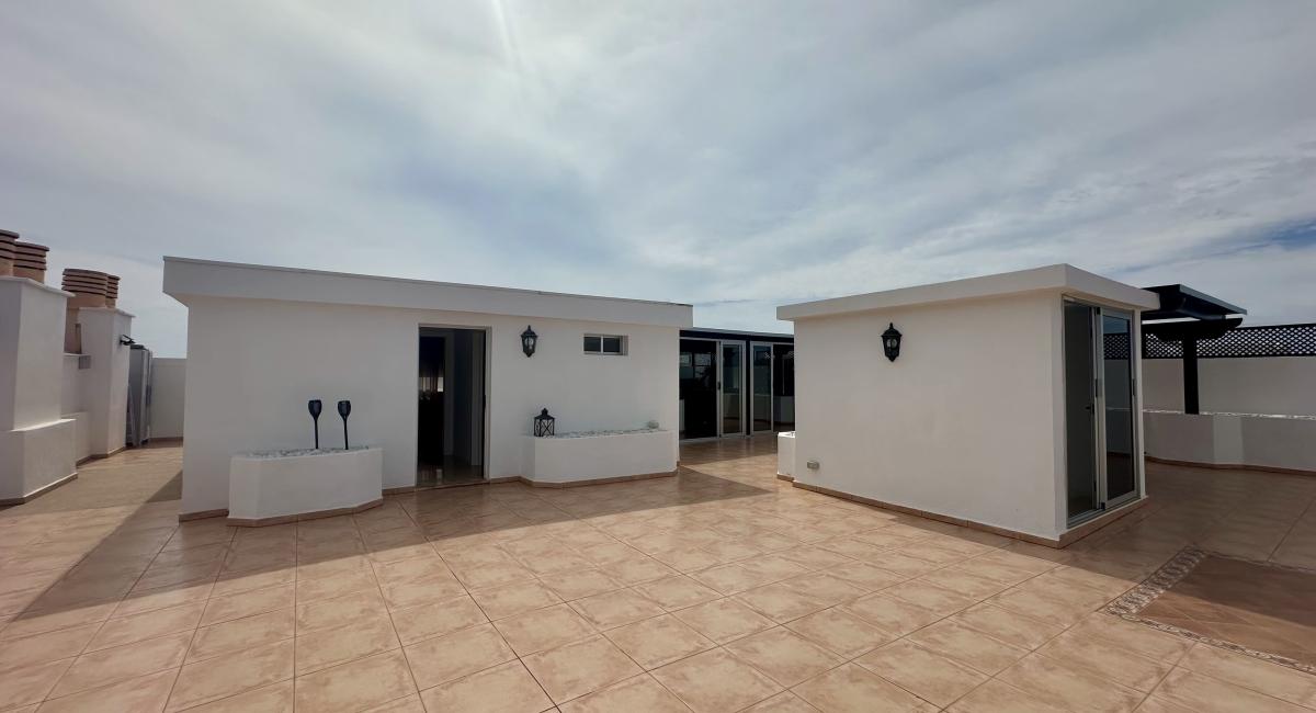 Este ático cuenta con dos amplios dormitorios matrimoniales y dos baños con ducha, además de un pequeño estudio en la terraza que incluye otra habitación matrimonial y baño. La joya de la corona es su enorme terraza de aproximadamente 200 m², equipada con una cocina y salón de verano, ideal para disfrutar del clima soleado y las vistas impresionantes al océano.