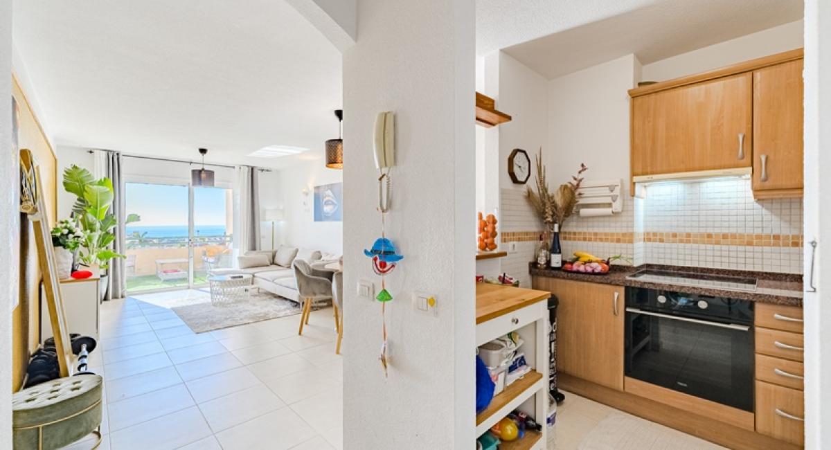 La vivienda cuenta con 73 m² interiores distribuidos en 2 dormitorios y 2 baños, además de una moderna cocina abierta integrada en el salón-comedor, creando un espacio amplio, luminoso y funcional. Desde el salón se accede a una agradable terraza de 11 m² con vistas al mar, ideal para disfrutar del excelente clima del sur de Tenerife durante todo el año.